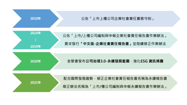 - 金管會督導證交所及櫃買中心於2021年修訂「上市(櫃)公司編製與申報永續報告作業辦法」,將原作業辦法中企業社會責任報告書更名為「永續報告書(Sustainability Report or ESG Report)」。